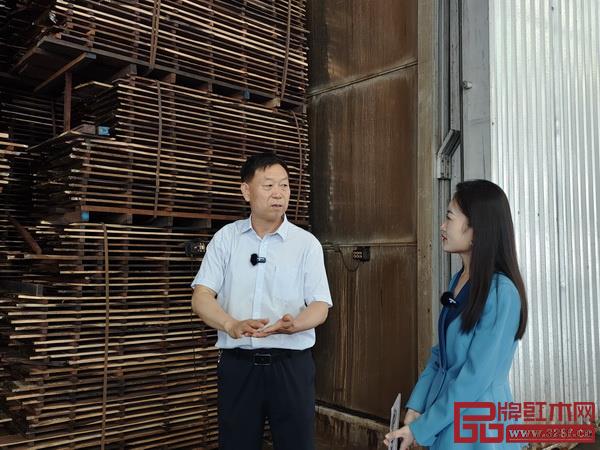 巧奪天工紅木董事長張愛冬(右)與主持人探訪巧奪天工紅木工廠二次烘干房