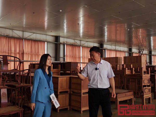 巧奪天工紅木董事長張愛冬(左)為主持人講解“烘干”原理