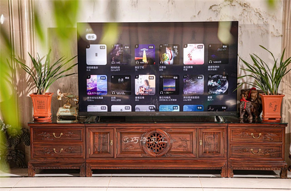 廳堂中還放置了鵬程萬里電視柜,該柜線條自然流暢,整體造型大氣沉穩(wěn)。兩個柜門中間透雕萬壽紋,四周配以海水江崖紋的水腳圖案,抽屜頂板和柜門雕刻蒼勁挺拔的松樹,連綿不斷的大山,寓意福山壽海,生生不息。