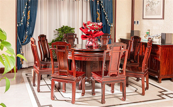 在中國的語境中,圓,是天圓地方,是花好月圓,圓是扎根在中國人內(nèi)心深處的執(zhí)念,圓也是紅木家具中不可或缺的元素之一,在本案例中也多有體現(xiàn)。