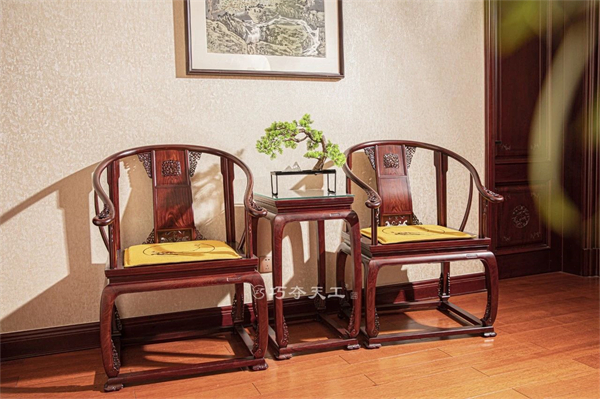 在休閑的區(qū)域,放置了一對皇宮椅,整體造型為上圓下方,外圓內(nèi)方,暗合中國傳統(tǒng)文化中的乾坤之說,乾為天為圓,坤為地為方,寓意天圓地方。人從容于天地之間,盡顯主人的“內(nèi)圣外王”的非凡氣度,而外圓內(nèi)方又是中國傳統(tǒng)品德,此為圓的另一體現(xiàn)。