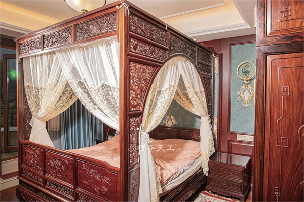 圓還體現(xiàn)在本案例的臥室中,此為花鳥雙月洞門架子床,借月設景,月圓,人圓。整體線條圓潤流暢,榫卯嚴密,造型考究,風格古樸而富麗,陳設室內(nèi),滿室生輝。