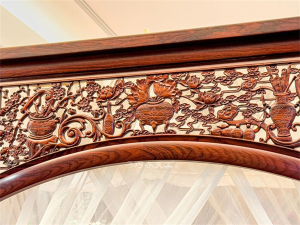床架透雕著各種寓意吉祥的博古紋、梅花紋、八寶紋,祥云環(huán)繞,意韻悠長?!坝袌D必有意,有意必吉祥”,花鳥雙月洞門架子床圖案紋飾體現(xiàn)了崇尚高雅的心境,也反映了對祥和及美好幸福生活的向往與追求。