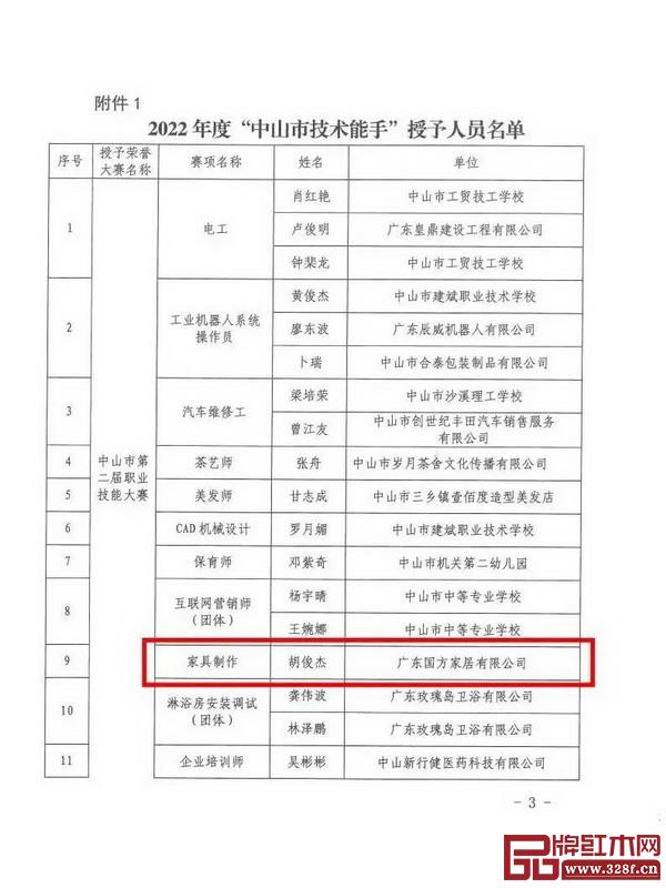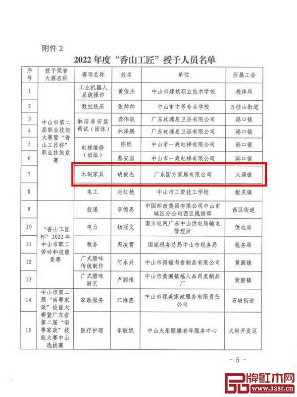 廣東國方家居有限公司(以下簡稱國方家居)整裝總監(jiān)、黨支部黨員胡俊杰榜上有名,被授予“中山市技術(shù)能手”“香山工匠”榮譽稱號。