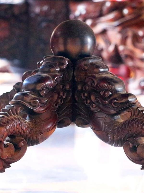 桌面直接采用一根大柱支撐,可見對木材的品質十分有信心。大柱型似葫蘆,中間浮雕白菜紋,寓意著平安、發(fā)財。底座三個龍頭腳,造型寓意龍騰盛世,三只腳形似山字,穩(wěn)如泰山。