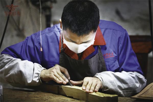 在家寶紅木生產車間,雕刻一個小的圖案就要多道工序甚至幾十把刀齊上陣,可謂是匠心巨制,千雕萬刻。