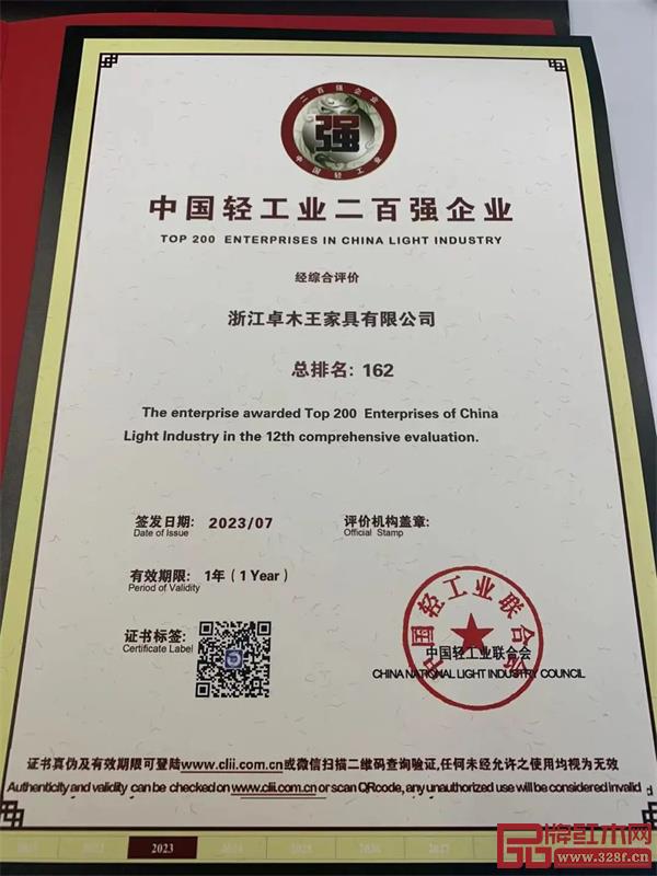 7月20日,由中國(guó)輕工業(yè)聯(lián)合會(huì)舉辦的“輕工業(yè)百?gòu)?qiáng)企業(yè)高峰論壇”在北京盛大舉行,工信部及發(fā)改委等部委相關(guān)領(lǐng)導(dǎo)、中國(guó)輕工業(yè)聯(lián)合會(huì)領(lǐng)導(dǎo)、著名企業(yè)家代表等發(fā)表重要講話,現(xiàn)場(chǎng)發(fā)布了2022年度中國(guó)輕工業(yè)二百?gòu)?qiáng)企業(yè)、中國(guó)輕工業(yè)科技百?gòu)?qiáng)企業(yè)等名單。卓木王憑借過硬的企業(yè)實(shí)力和品牌影響力榮獲2022年度“中國(guó)輕工業(yè)二百?gòu)?qiáng)企業(yè)”榮譽(yù)。