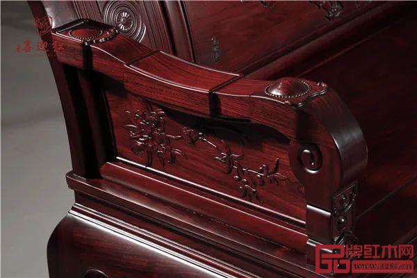 此套沙發(fā)的靠背的搭腦兩端作長(zhǎng)鼻微卷,配合如意云紋、拐子紋修飾,形成生動(dòng)的“大平有象意境。兩象合起來(lái)看,又組成一個(gè)向下卷轉(zhuǎn)的云紋,靈動(dòng)而別有風(fēng)韻。同時(shí),輔以氣象榮華的花中之王牡丹,十分雍容華貴。沙發(fā)靠背兩旁,以生生不息的太陽(yáng)紋為設(shè)計(jì)元素,天仙了文化與生活藝術(shù)化融合。