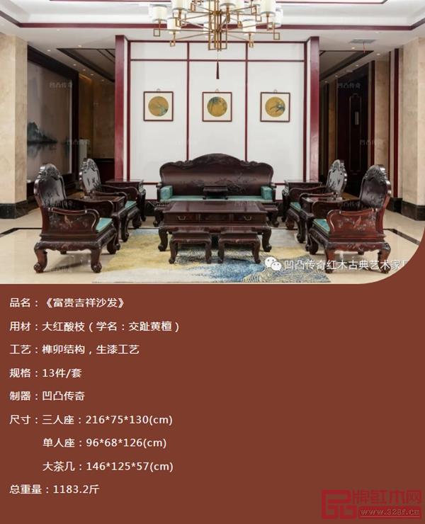 此款沙發(fā)通體精選老撾大紅酸枝老料制作,色澤沉穆,木紋清晰,結(jié)構(gòu)細(xì)密,古色古香。沙發(fā)用料壯碩,13件套的沙發(fā)總重量達(dá)1183斤,使整套沙發(fā)彰顯出恢宏氣勢,也體現(xiàn)出凹凸傳奇堅持的宗旨——為求精品,不惜用料。
