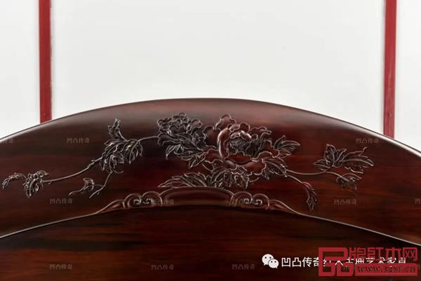 沙發(fā)座椅為三圍屏板,搭腦呈波浪形,左右兩邊往中間漸高,開委角過渡,線條婉轉(zhuǎn),流暢圓潤,精致典雅。搭腦雕刻如意云紋、牡丹花紋和卷草紋,表達(dá)如意當(dāng)頭、富貴好運(yùn)、步步高升的寓意。