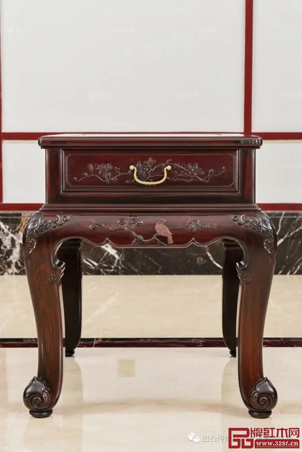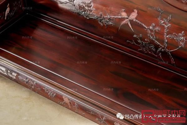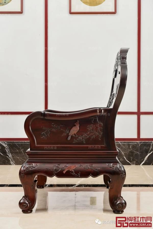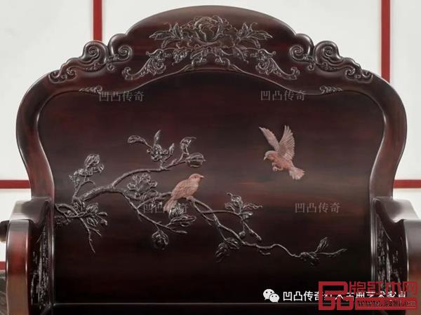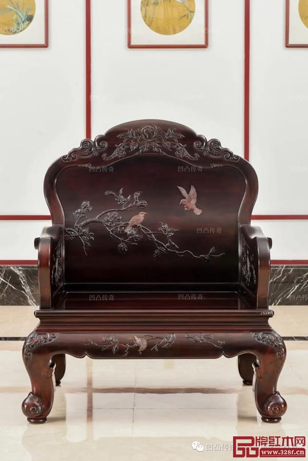 花鳥紋飾一靜一動,鳥語花香,趣意盎然,雅俗共賞,寄托著對生活的美好祝愿?;B紋飾的恰當(dāng)應(yīng)用,也讓整套沙發(fā)的文化主題得到了升華。