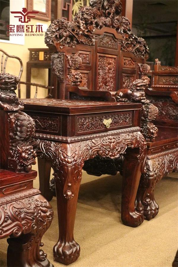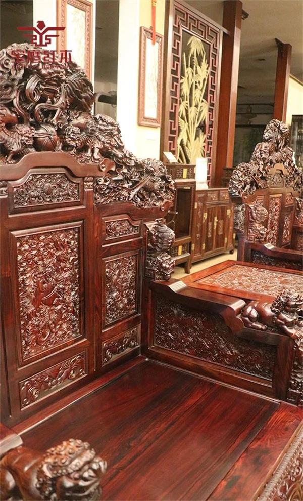 在中華文化的歷史長河中,有無數(shù)動人的傳說與典故,人們把對美好事物的期望、追求、寄托,變?yōu)橐粋€個吉祥的圖案融入在生活中。家寶紅木將古人之向往融入到家具設(shè)計之中,手工深雕制作,家寶紅木《盛世中華沙發(fā)》才得以呈現(xiàn)。