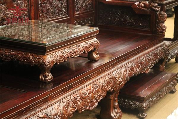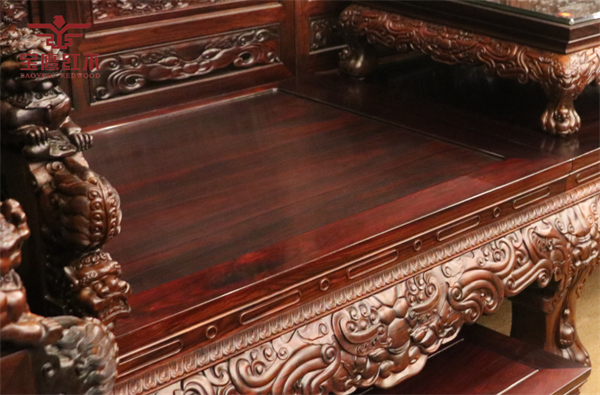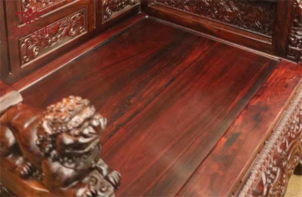 《盛世中華沙發(fā)》通體老撾大紅酸枝制作而成,色澤沉穆,木紋清晰,結(jié)構(gòu)細密,古色古香。沙發(fā)用料壯碩,使整套沙發(fā)彰顯出恢宏氣勢,也體現(xiàn)出家寶紅木為求精品,不惜用料的宗旨。