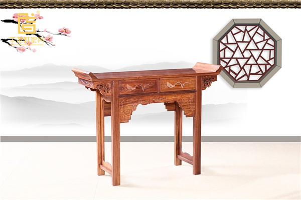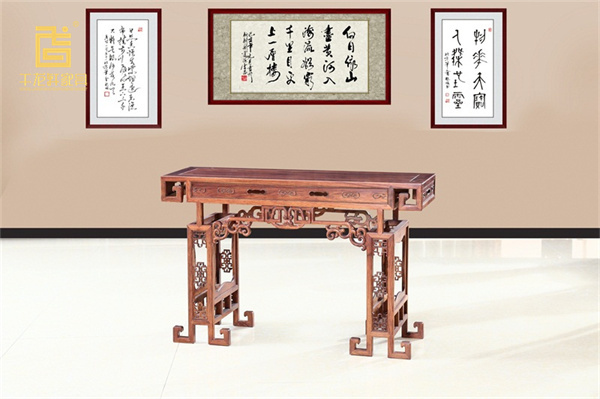 在方框中經(jīng)常做窗格透欞狀,或透雕靈芝紋等圖案,托泥下開小壺門,一般腿微向外撇,方框腿將兩條方腿之間的空間充分利用起來,增加了案子的體量感和穩(wěn)定感,兩側(cè)檔板又起到裝飾美化的作用。