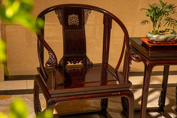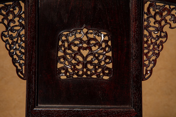 巧奪天工紅木董事長張愛冬:巧奪天工紅木的皇宮椅,總體比例把控妥當(dāng),椅圈流暢優(yōu)美,腿足剛勁有力,雕刻細致生動,給人穩(wěn)重中透著靈動的感覺?;蕦m椅整體造型為上圓下方,外圓內(nèi)方。后背板為梯形,上窄下寬。呈S形,為三截攢框設(shè)計,上截開光鏤空立體雕卷草紋,中截平裝,下截雕云紋朝下亮腳,像倒掛的蝙蝠,寓意福到。