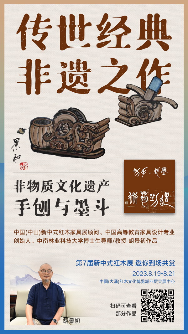 傳世經(jīng)典,非遺之作。手刨與墨斗是我國的非物質(zhì)文化遺產(chǎn),8月19日-21日,在第七屆新中式紅木展中,非物質(zhì)文化遺產(chǎn)“手刨與墨斗”景初書畫展將會展出中國(中山)新中式紅木家具展顧問、中國高等教育家具設(shè)計專業(yè)創(chuàng)始人、中南林業(yè)科技大學(xué)博士生導(dǎo)師/教授胡景初的部分手刨與墨斗書畫作品。