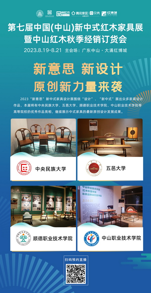 8月19-21日,2023“新意思”新中式紅木家具設(shè)計展(以下簡稱新意思設(shè)計展)也將在紅博城舉行。前幾屆展覽均圍繞“設(shè)計”、“新中式”展出眾多家具設(shè)計作品,本屆將有中央民族大學(xué)、五邑大學(xué)、中山職業(yè)技術(shù)學(xué)院、順德職業(yè)技術(shù)學(xué)院等高等院校的優(yōu)秀作品亮相,繼續(xù)展示中式家具的最新發(fā)展成果。