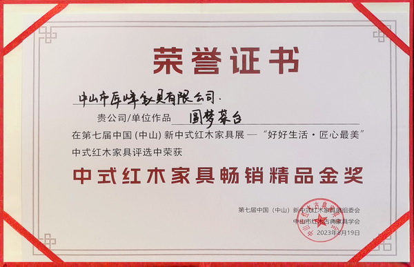 [摘要]8月19日,中山市匠峰家具有限公司攜精品家具參加2023新中式紅木展,《圓夢茶臺》斬獲“中式紅木家具暢銷精品獎”。