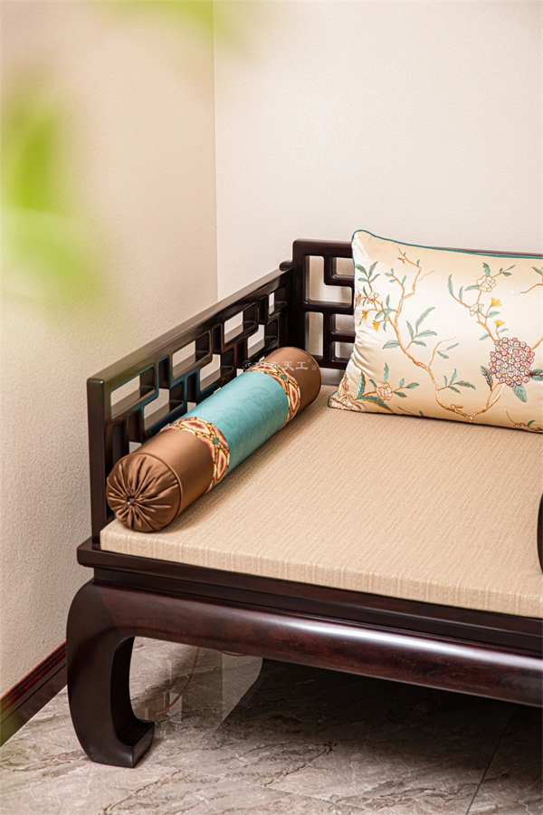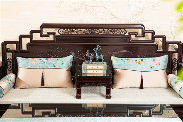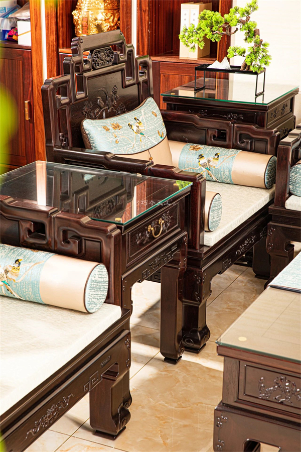 巧奪天工鳥語花香沙發(fā)與墻面圖案相互呼應(yīng),淺藍色系的軟搭讓紅木增添了幾分柔美,使客廳清新雅致,又富有溫度。