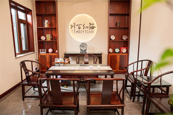茶室也是顯示主人品性之所,本案例的主人選取了“海納百川”書法作品裝飾茶室,此外除了茶葉茶具,無過多裝飾修飾之物,可見主人有著豁達坦率之性情。