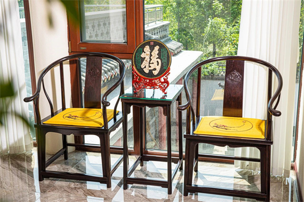 走出茶室,來到窗邊,可見一對明式螭龍紋圈椅,此圈椅背板上部如意形內(nèi)雕螭龍母子,故名為螭龍紋圈椅。