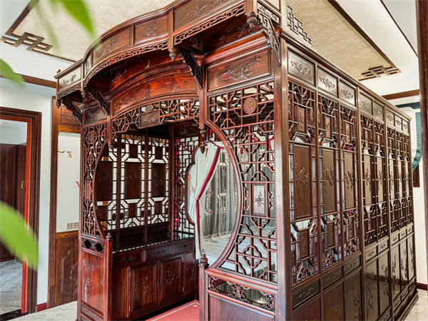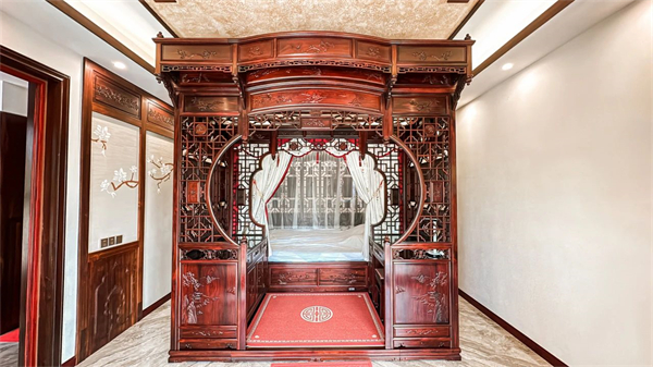 拔步床可容納梳妝臺、儲物柜等放置其中,整體布局猶如房中又套了一座小房屋,形成了一種床中床、罩中罩的感覺,大大提高了睡眠空間的舒適和私密程度。