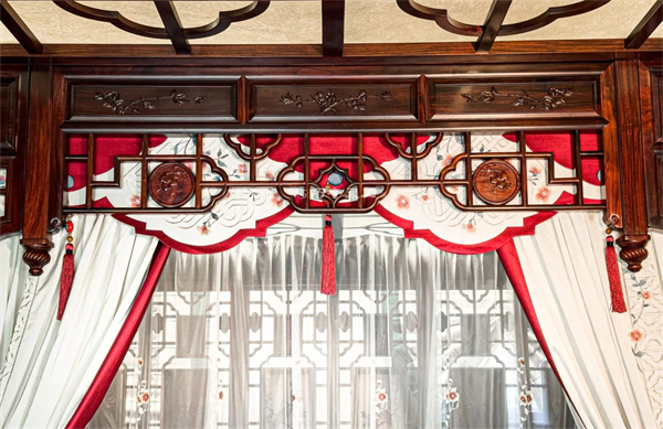 月洞門上為掛檐,鑲板作浮雕山水圖,檐下作燈籠錦,攢成十字連海棠紋,床圍浮雕的山水終與掛檐處呼應(yīng),各處雕飾栩栩如生,俱得其妙。