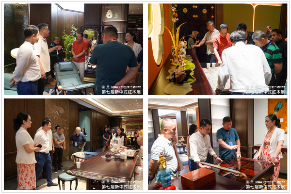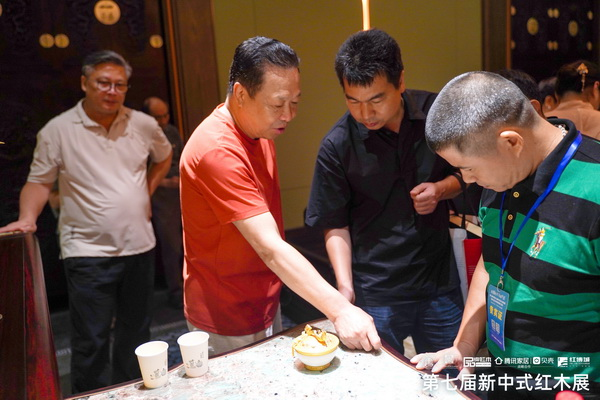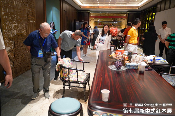 全聯(lián)藝術(shù)紅木家具專業(yè)委員會(huì)專家顧問、中國(guó)高等教育家具設(shè)計(jì)專業(yè)創(chuàng)始人胡景初(左一)現(xiàn)場(chǎng)品鑒央璽品牌家具
