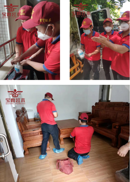 送貨上樓,進(jìn)入顧客家中必須進(jìn)行手部消毒,穿戴帽子、口罩、鞋套,家具擺放到位,組裝墊平、打掃擦拭、擺放坐墊一次到位;最后客戶驗收簽字。