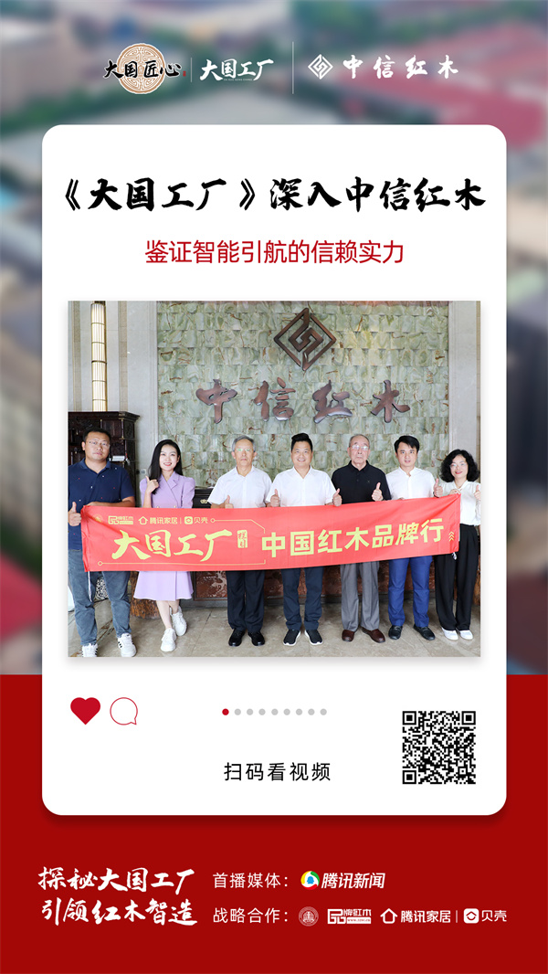 近日,由品牌紅木聯(lián)合騰訊家居|貝殼,與全聯(lián)民間文物藝術(shù)品商會(huì)藝術(shù)紅木家具專業(yè)委員會(huì)共同策劃打造的高端權(quán)威欄目《大國(guó)工廠》,攜手央視主持人,和全國(guó)工商聯(lián)藝術(shù)紅木家具專業(yè)委員會(huì)專家顧問(wèn)、《紅木家具通用技術(shù)條件》標(biāo)準(zhǔn)主要起草人曹新民,全國(guó)工商聯(lián)藝術(shù)紅木家具專業(yè)委員會(huì)專家顧問(wèn)、華南農(nóng)業(yè)大學(xué)教授李凱夫,全國(guó)工商聯(lián)藝術(shù)紅木家具專業(yè)委員會(huì)執(zhí)行會(huì)長(zhǎng)、《大國(guó)匠心&大國(guó)工廠》欄目策劃人、品牌紅木CEO林偉華,與全國(guó)工商聯(lián)藝術(shù)紅木家具專業(yè)委員會(huì)主席團(tuán)主席、浙江省工藝美術(shù)大師、中信紅木董事長(zhǎng)李忠信,一起走進(jìn)東陽(yáng)紅木龍頭企業(yè)——中信紅木,為你鑒證智能引航的信賴實(shí)力。