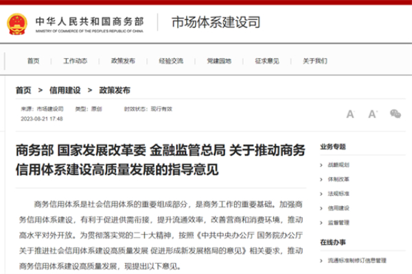 8月21日,商務(wù)部、國家發(fā)展改革委、金融監(jiān)管總局等三部門聯(lián)合發(fā)布《關(guān)于推動商務(wù)信用體系建設(shè)高質(zhì)量發(fā)展的指導(dǎo)意見》,提出積極發(fā)展信用銷售,促進信用消費發(fā)展,支持發(fā)展信用融資,規(guī)范發(fā)展信用評價。具體包括:合理增加對消費者購買汽車、家電、家居等產(chǎn)品的消費信貸支持;深入推進家政服務(wù)等民生消費領(lǐng)域信用建設(shè)等?!兑庖姟愤€提出,要實現(xiàn)商務(wù)領(lǐng)域各類經(jīng)營主體多維度的信用記錄與全國信用信息共享平臺的交換共享。