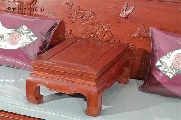 炕幾,也叫靠幾,通常置放在炕的兩頭或中間,即可依憑,上面又可陳設(shè)器物或擺放用具以供把玩。在紅木家具中,或于長形梳化中間,或于羅漢床上可見,形制雖小,功能強大。