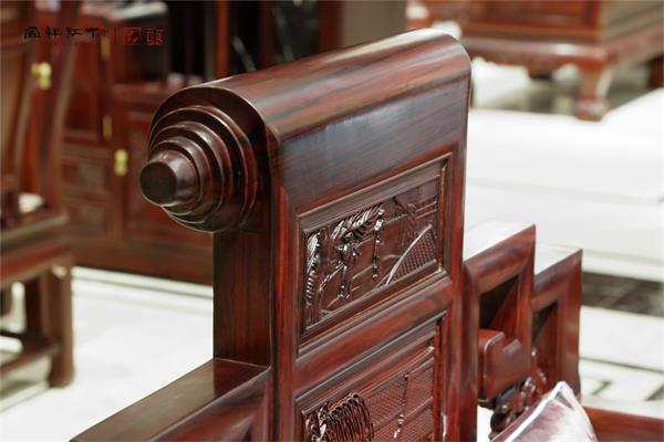當人置身紅木家具中時,巧妙的卷書造型,能讓人的頸椎得到舒適的依托,讓肌肉放松,血液通暢,從而達到養(yǎng)生的功效。