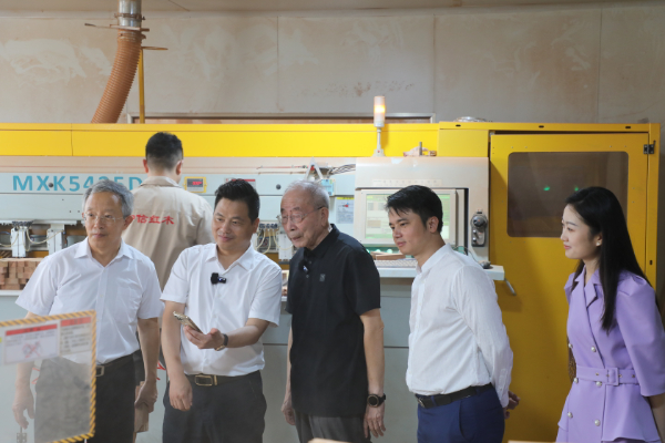 全國(guó)工商聯(lián)藝術(shù)紅木家具專業(yè)委員會(huì)專家顧問、《紅木家具通用技術(shù)條件》標(biāo)準(zhǔn)主要起草人曹新民(左三),全國(guó)工商聯(lián)藝術(shù)紅木家具專業(yè)委員會(huì)專家顧問、華南農(nóng)業(yè)大學(xué)教授李凱夫(左一),全國(guó)工商聯(lián)藝術(shù)紅木家具專業(yè)委員會(huì)執(zhí)行會(huì)長(zhǎng)、《大國(guó)匠心&大國(guó)工廠》欄目策劃人、品牌紅木CEO林偉華(右二),全國(guó)工商聯(lián)藝術(shù)紅木家具專業(yè)委員會(huì)主席團(tuán)主席、浙江省工藝美術(shù)大師、中信紅木董事長(zhǎng)李忠信(左二)與央視主持人(右一)參觀中信紅木智能化工廠