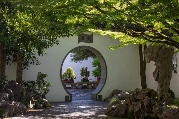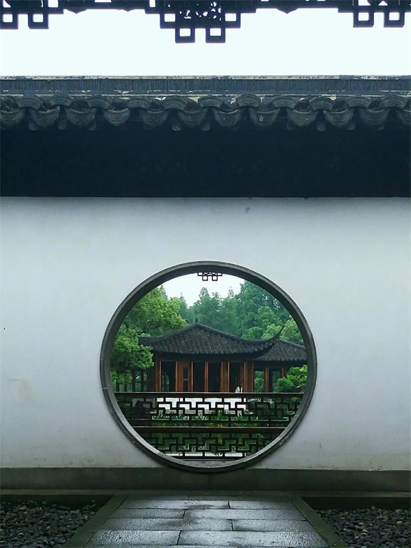 月洞門(mén),是中國(guó)古典建筑中常見(jiàn)的過(guò)徑門(mén)形式,門(mén)體無(wú)門(mén)禁,通常用于園林建筑中兩院之間的隔斷,也有用于做大房間中的阻隔。因其形如滿月,取通俗“圓滿”之意,古雅寧?kù)o,頗具清幽意蘊(yùn)。