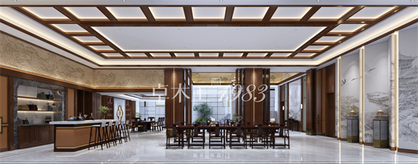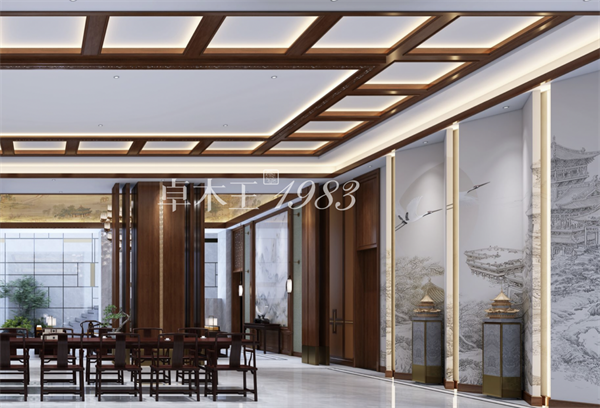 茶室自然木質(zhì)的紅木肌理質(zhì)感和軟裝壁畫相映成趣,墻壁上的軟裝山水畫和紅木交疊平鋪,窗外生機(jī)勃勃的綠林也給空間帶來了更多延伸與想象。