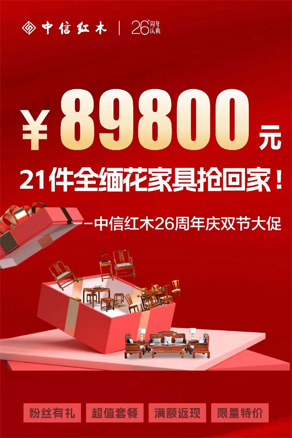 中信紅木開(kāi)展“26周年慶雙節(jié)大促”活動(dòng),以“粉絲有禮、超值套餐、滿額返現(xiàn)、限量特價(jià)”等福利歡慶中秋國(guó)慶,只需89800元即可將21件緬花家具搶回家,中信品質(zhì)值得信賴(lài)。