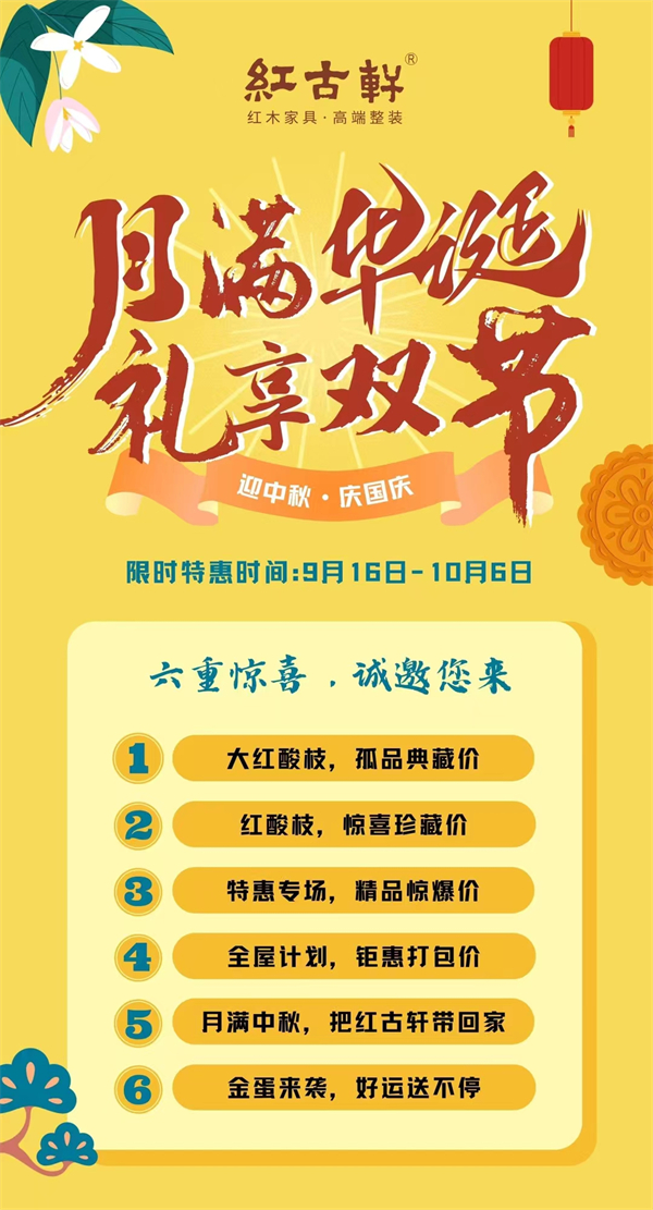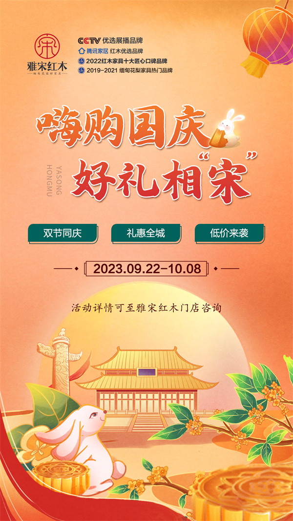 9月22日—10月8日,雅宋紅木開(kāi)展“嗨購(gòu)國(guó)慶·好禮相‘宋’”活動(dòng),以“雙節(jié)同慶、禮惠全城、低價(jià)來(lái)襲”等福利,獻(xiàn)禮中秋國(guó)慶。