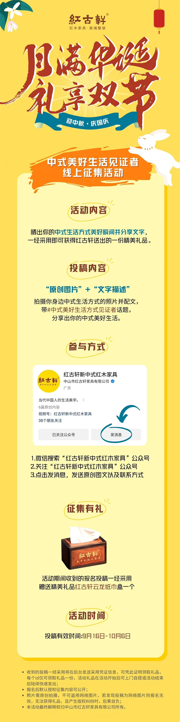 紅古軒還開(kāi)展“中式美好生活見(jiàn)證者線上征集活動(dòng)”,全國(guó)消費(fèi)者可將自己拍攝的關(guān)于中式生活方式照片配上文字描述,投稿至“紅古軒新中式紅木家具”公眾號(hào)后臺(tái),活動(dòng)期間收到的報(bào)名投稿一經(jīng)采用,即有精美禮品贈(zèng)送。