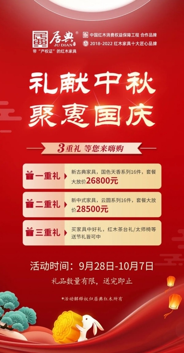 9月28日—10月7日,居典紅木開(kāi)展“獻(xiàn)禮中秋·聚惠國(guó)慶”活動(dòng),以“三重好禮”等福利獻(xiàn)禮中秋國(guó)慶。