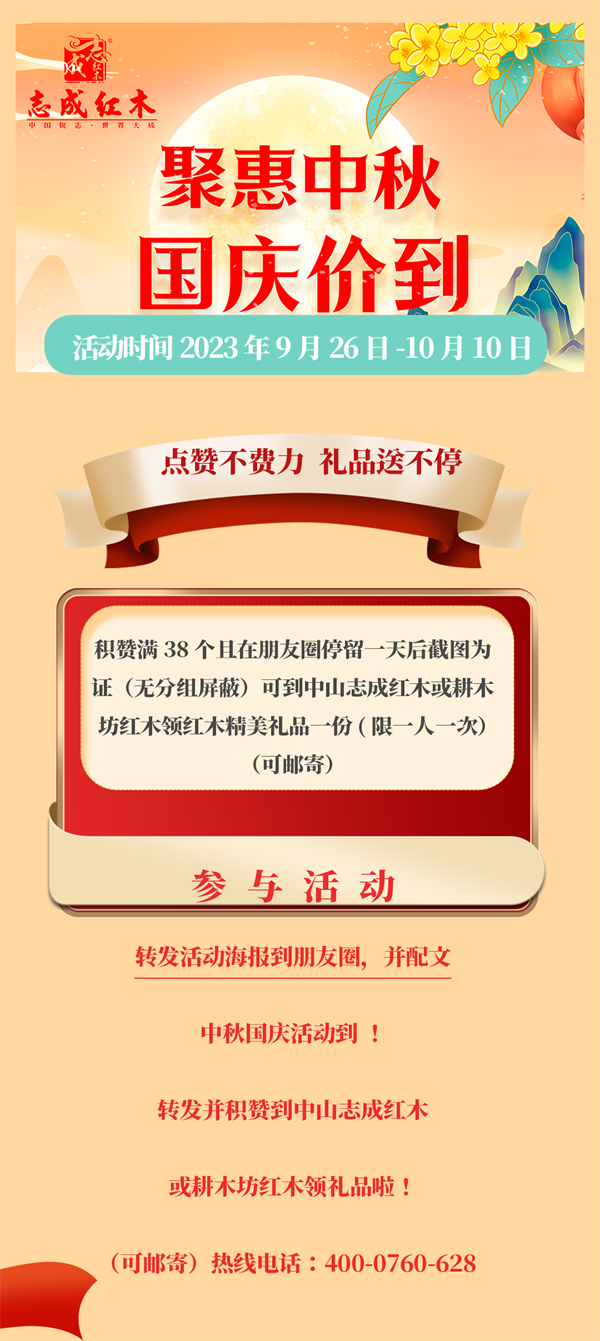9月26日—10月1日,志成紅木開(kāi)展“聚惠中秋·國(guó)慶價(jià)到”活動(dòng),以“點(diǎn)贊不費(fèi)力,禮品送不?!钡雀@I(xiàn)禮中秋國(guó)慶。