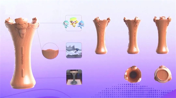 花器造型靈感來自中國南宋時(shí)期的官窯花觚,由國家級(jí)非物質(zhì)文化遺產(chǎn)東陽木雕制作而成。花觚的設(shè)計(jì)前后經(jīng)歷了12輪修改,整體高度18厘米,非常精致小巧,瓶口融合了吉祥物和錢塘潮的元素,起伏的水紋取自浙江山水詩意的韻律之美,瓶口吉祥物造型以活潑歡快的姿態(tài)慶祝勇奪桂冠的勝利喜悅。
