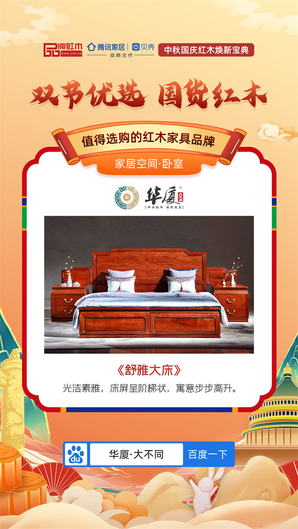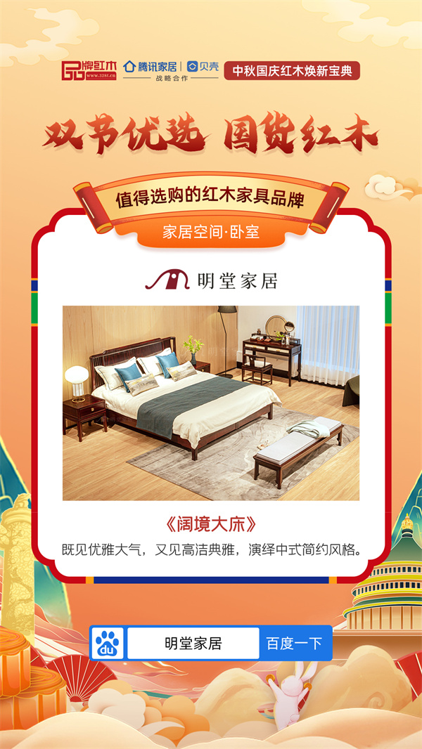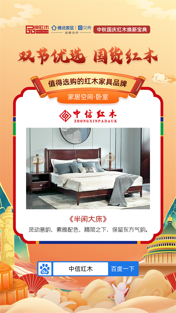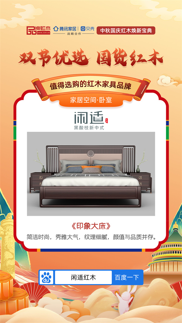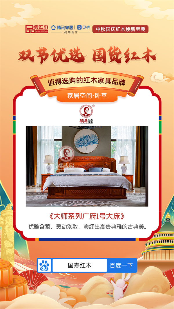 品牌紅木、騰訊家居貝殼聯(lián)合推出“中秋國(guó)慶紅木煥新寶典”,以“雙節(jié)優(yōu)選 國(guó)貨紅木”為主題,精選十一款臥室空間紅木好物,讓你不再為選購紅木家具而煩惱!