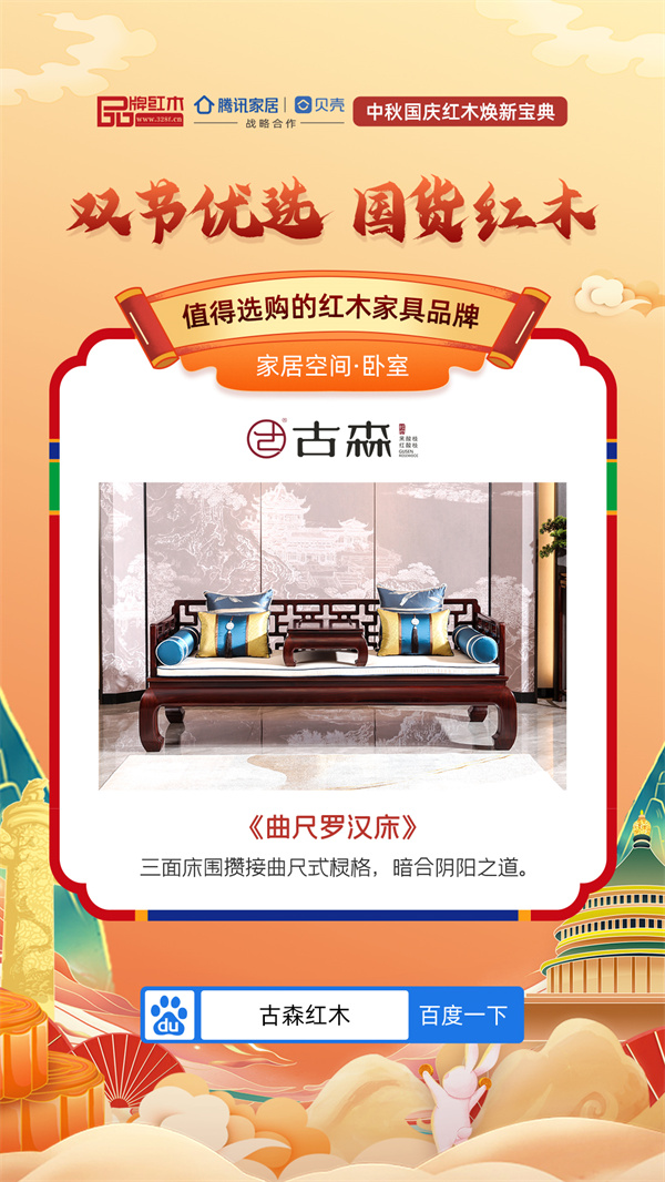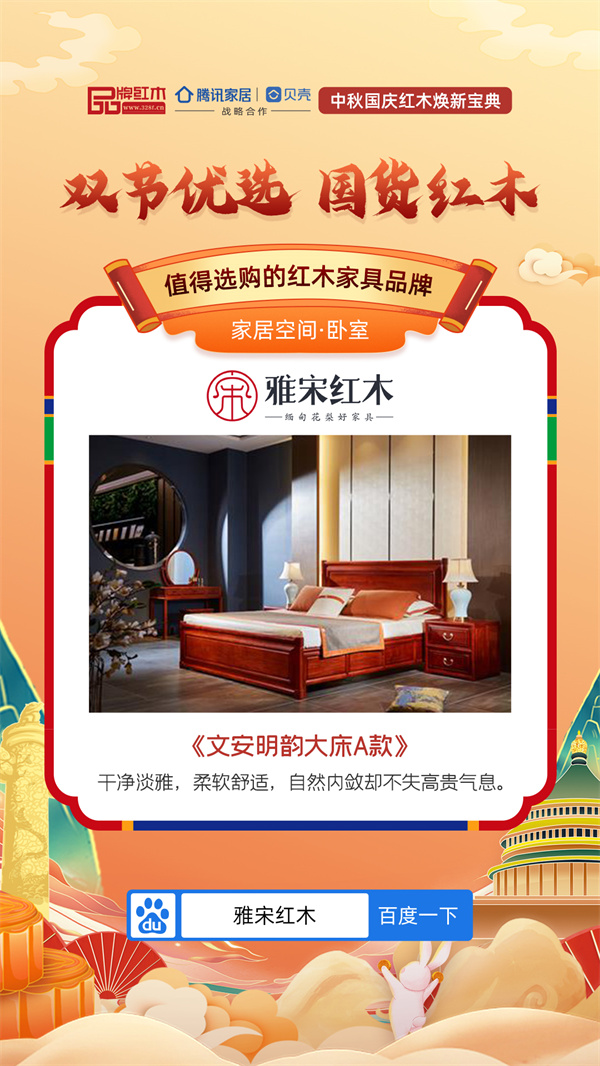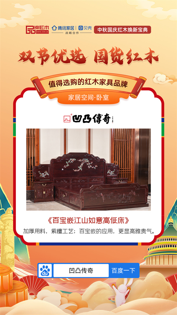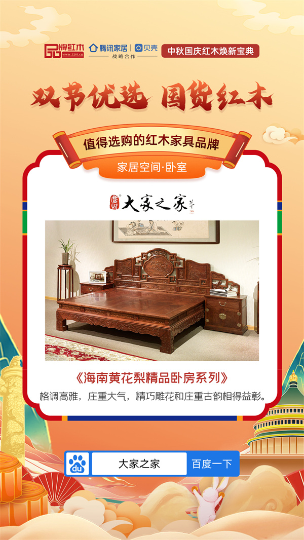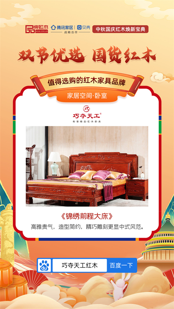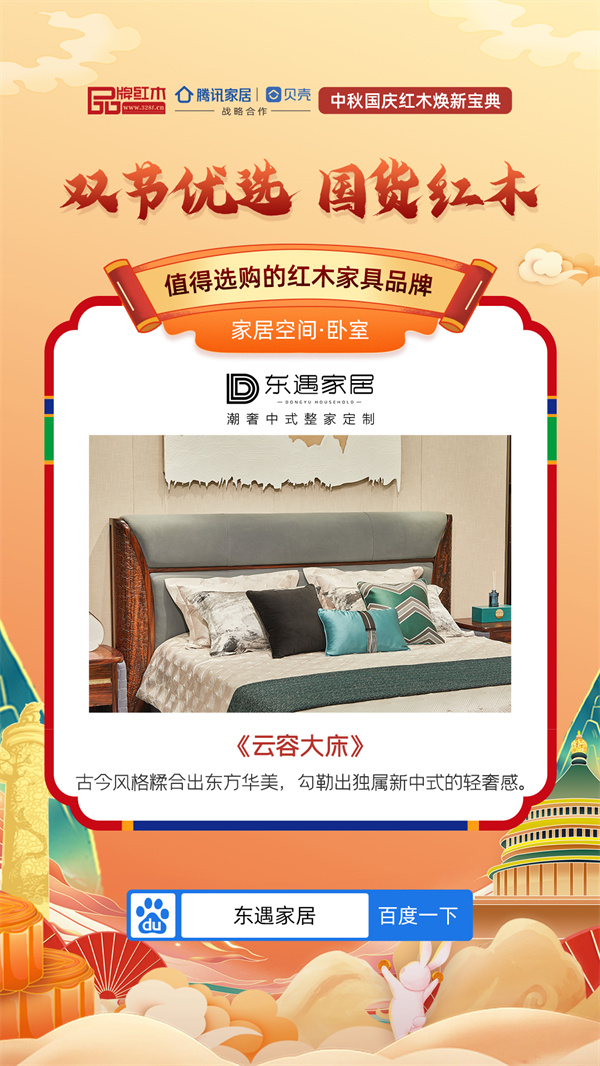 品牌紅木、騰訊家居貝殼聯(lián)合推出“中秋國(guó)慶紅木煥新寶典”,以“雙節(jié)優(yōu)選 國(guó)貨紅木”為主題,精選十一款臥室空間紅木好物,讓你不再為選購紅木家具而煩惱!