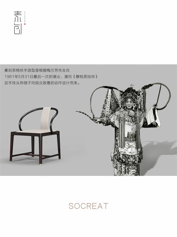 《素創(chuàng)茶椅》造型別致優(yōu)雅,扶手造型是根據(jù)梅蘭芳先生在1961年5月31日表演完《穆桂英掛帥》后,手扶頭飾翎子向觀眾致意的動作設(shè)計而來。