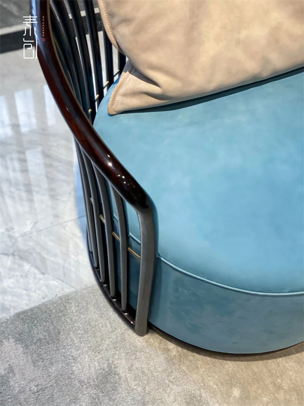 素創(chuàng)設(shè)計師眾多色彩中選擇了安謐的藍(lán),藍(lán)是能讓人瞬間沉靜的顏色,溫柔靜謐,能緩和條紋烏木黑褐色帶來的厚重感,凸顯出《素創(chuàng)潤椅》的休閑與輕盈,擺放在落地窗前,能延伸出別具一格的風(fēng)情。