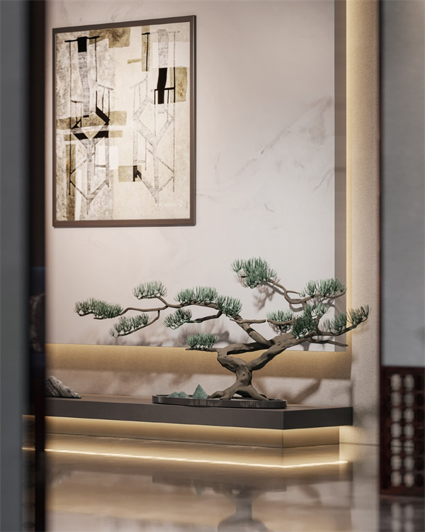 小巧的古建筑擺件、古色古香的掛畫、充滿生機的綠植,恰到好處的陳設與擺件,與茶室景觀相互交融成雅致禪意的空間。沏一盞暖暖的茶水,短暫隔絕所有的煩擾喧囂,有簡單、有交替地在文化古典雅致的包裹下與當代調(diào)性相融合,營造出心中最為理想的桃花源。