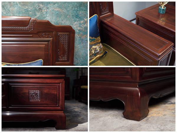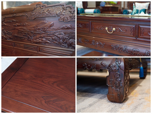 這套家具在選材方面非常突出,紅酸枝油性大、硬度高、強(qiáng)度大,它的紋理也非常美麗。