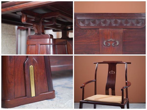 整個(gè)家具選材非常講究,特別是采用了古森紅木的六漆六磨,使家具的表面體現(xiàn)得圓潤。再一個(gè)就是家具的設(shè)計(jì),鼓腿膨牙鼓起來了,雕飾紋理也很清晰、打磨很到位,這就充分體現(xiàn)了東陽木雕工藝的技術(shù)水平。
