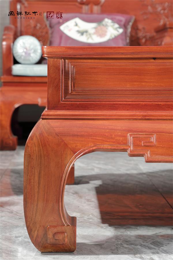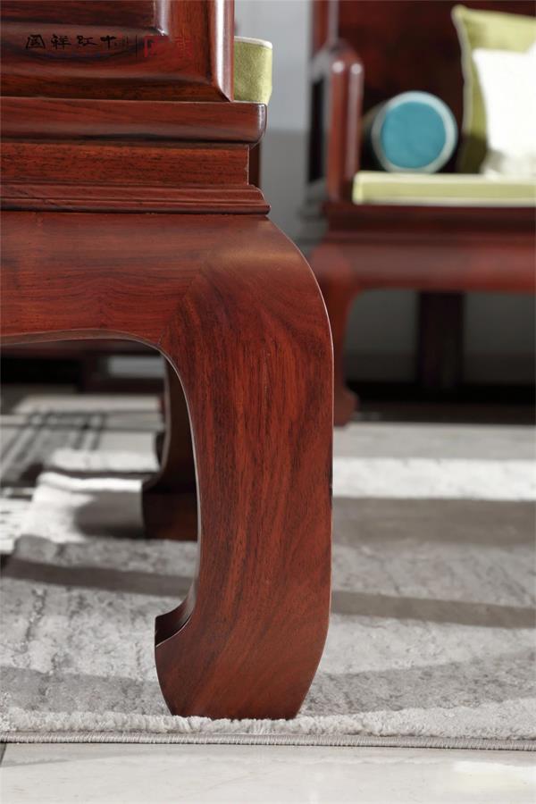 三彎腿腳型設計不僅使紅木家具顯得千姿百態(tài)、圓渾流暢,整體造型流暢舒展,飄逸富于動感;加上雕刻裝飾和鑲嵌點綴,視覺效果極其強烈,形成了富有高貴氣質(zhì)的視覺沖擊,倍顯雍容華貴,其線腳的走勢,散發(fā)富于流動感的美妙韻律,令人回味不已。